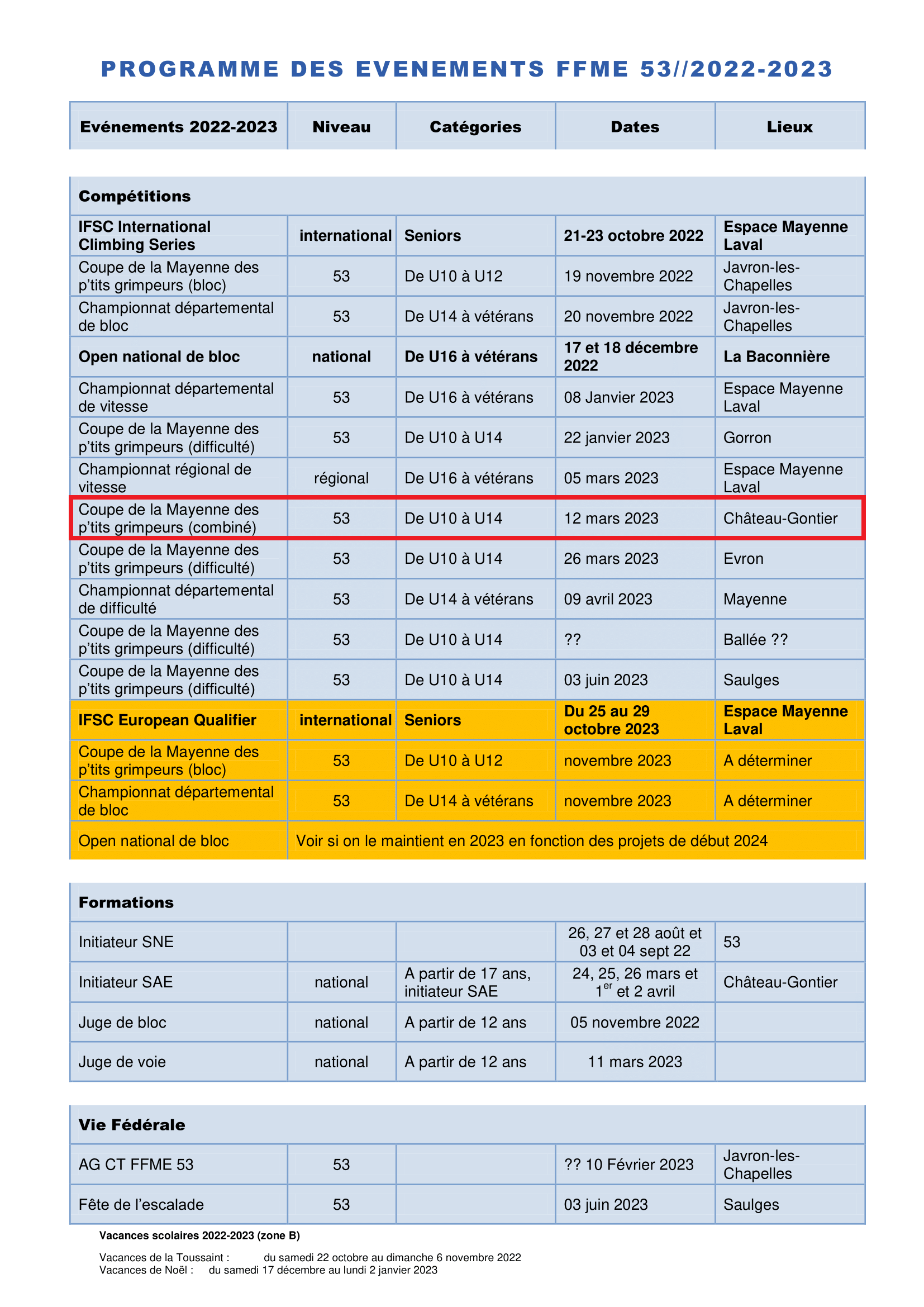 Evénements 2019-2020 | Clubs concernés | Niveau | Dates | Lieux et horaires |